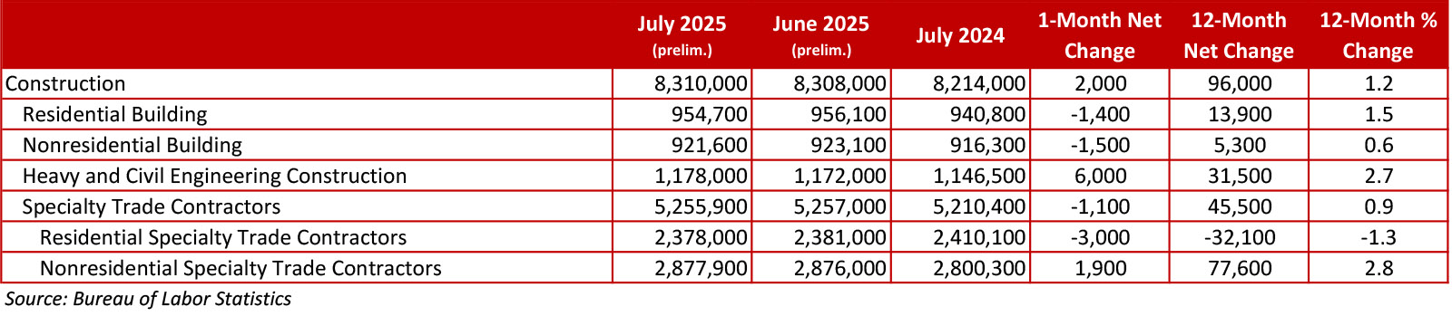 Overall construction employment totaled 8,310,000, seasonally adjusted, in July. Employment rose by 96,000 or 1.2 percent from July 2024 to last month. That gain was less than half as much as the increase of 200,000 jobs (3.1 percent) in the previous 12 months, Simonson noted.