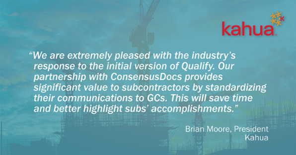 “We are extremely pleased with the industry’s response to the initial version of Qualify,” said Brian Moore, President of Kahua. “Our partnership with ConsensusDocs provides significant value to subcontractors by standardizing their communications to GCs. This will save time and better highlight subs’ accomplishments.”