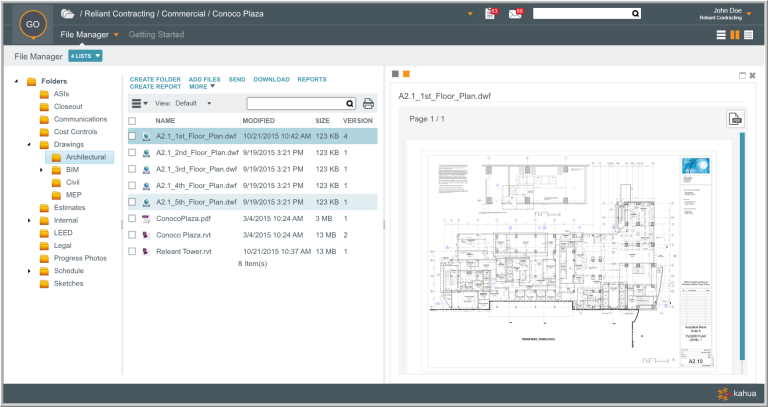Kahua File Manager is a powerful collaboration tool that enables you to upload files to a unique folder structure per project, share folders or files with other companies, and access folders and files from other companies via sharing.