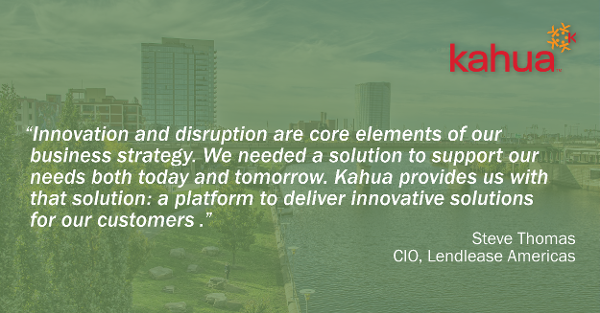 The Kahua Network, delivered as an Application Platform as a Service (aPaaS), will connect Lendlease with its customers and supply chain, allowing applications, business processes and information to be shared across organizations to more effectively manage the delivery process for its clients.